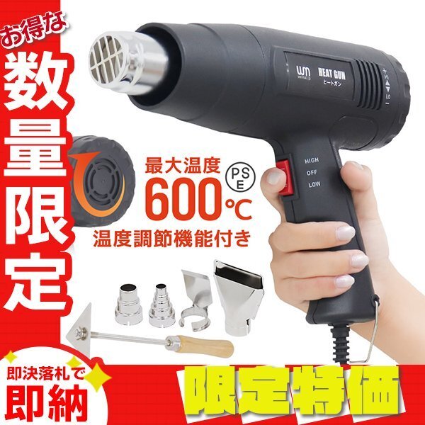 > 【限定セール】ヒートガン 超強力ホットガン 温度調節 最大600℃ 1600W 風量調節 PSE認証 アタッチメント付 塗装 シュリンク 包装 熱処理