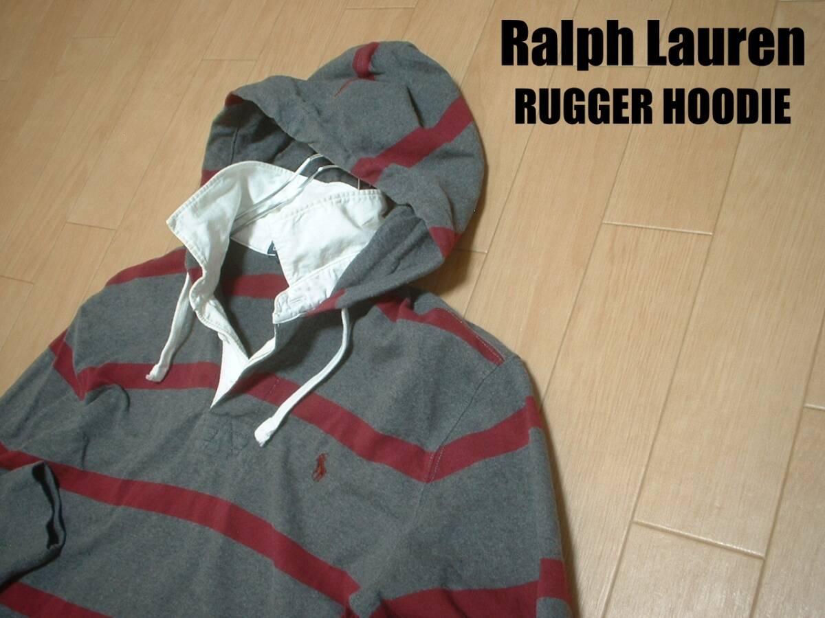 - 希少Ralph Laurenフード&エルボーパッチ付きラガーシャツXLパーカー杢グレーxバーガンディ正規ラルフローレンRUGBYラグビーフーディPOLO by