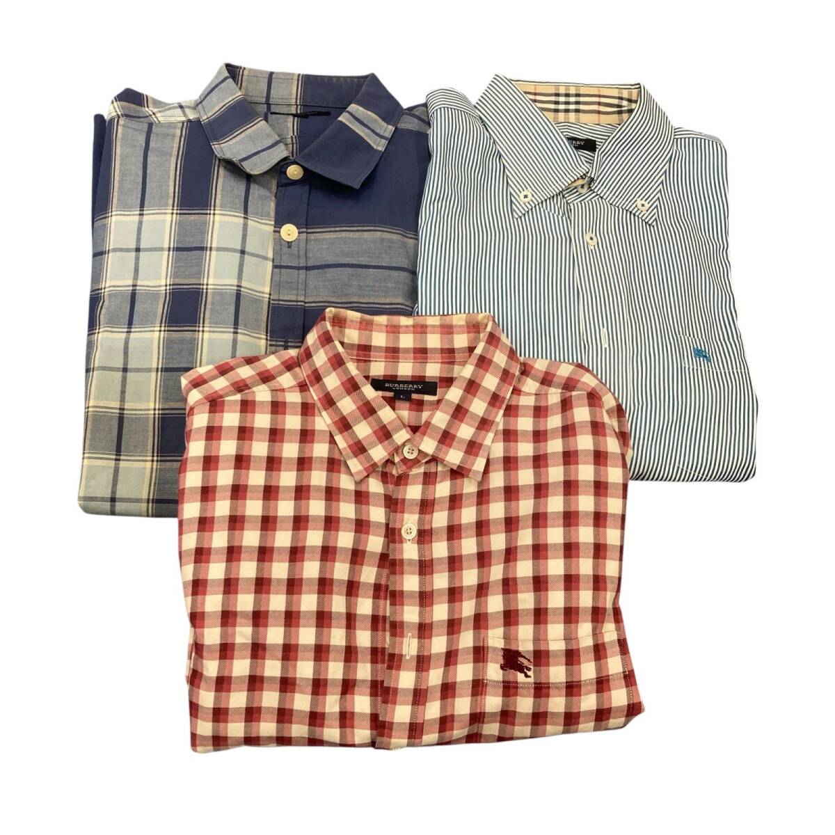 > △ BURBERRY LONDON チェックシャツ 3点 まとめ商品 ストライプ 長袖 赤青 赤系 バーバリーロンドン シャツ メンズ 日本製 L LL 0.73kg