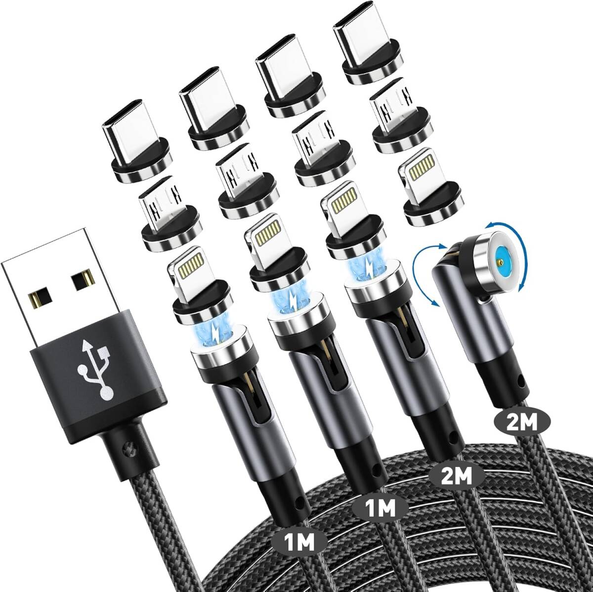 - マグネット 充電ケーブル 3in1 USB 【4本セット・1m+1m+2m+2m】