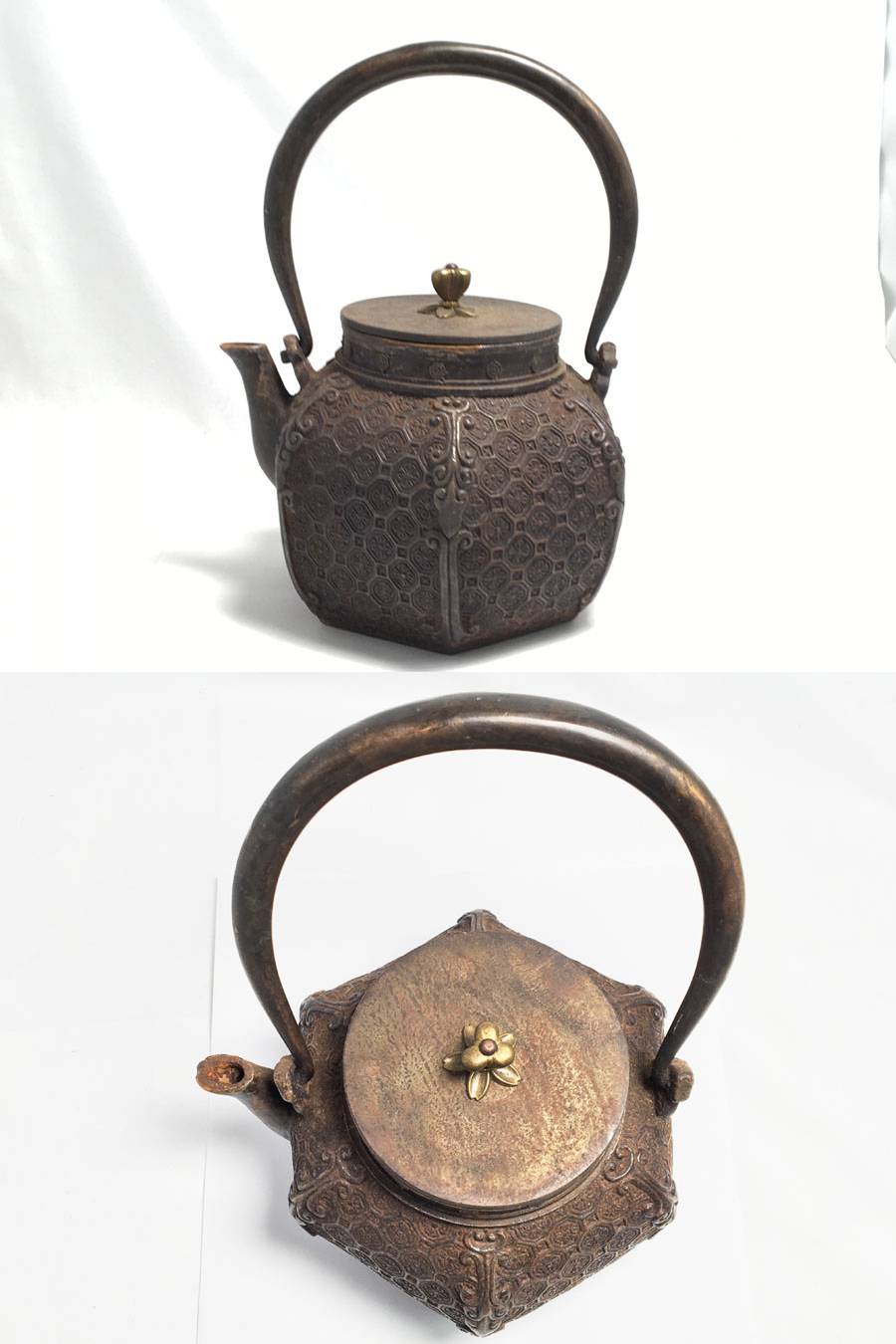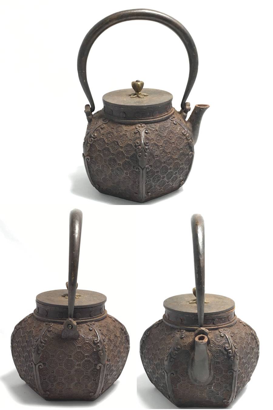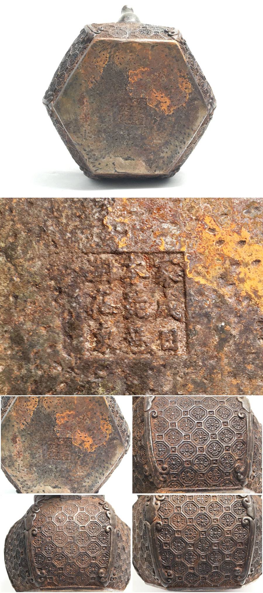 > 底面刻印 銘有 鉄器 古玩 六角鉄瓶 約1.8kg 幾何紋 湯釜 鉄瓶 南部鉄瓶 骨董鉄瓶 茶道具 煎茶道具 水漏れなし