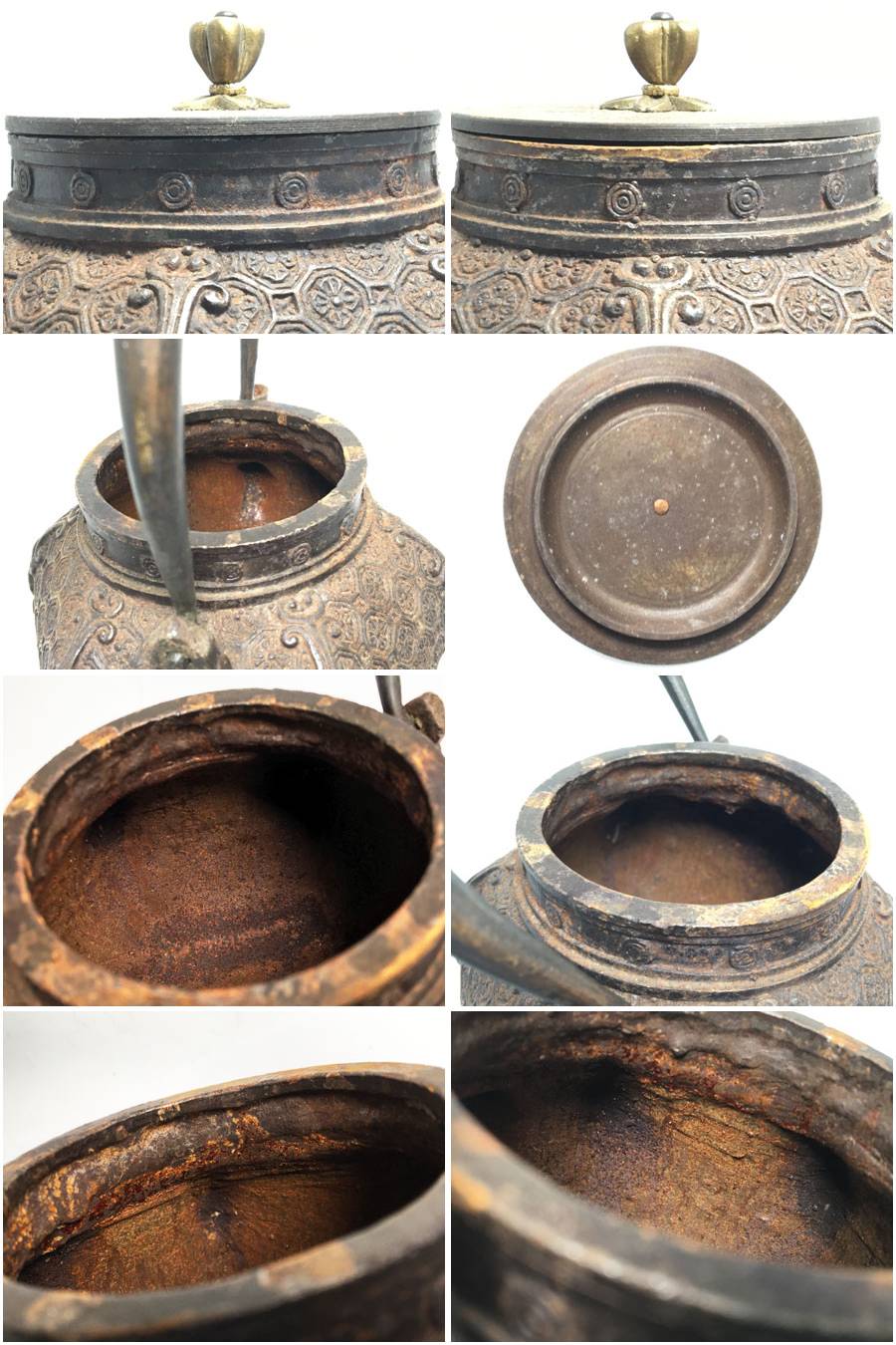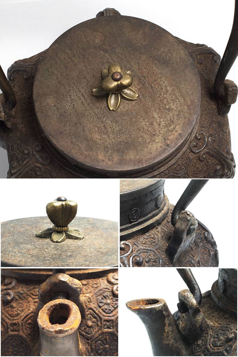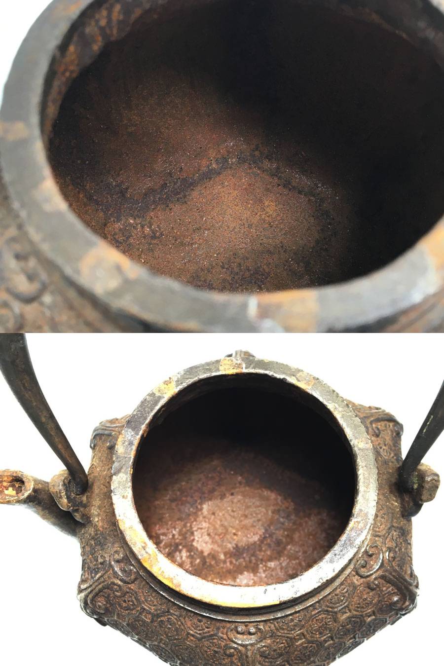 > 底面刻印 銘有 鉄器 古玩 六角鉄瓶 約1.8kg 幾何紋 湯釜 鉄瓶 南部鉄瓶 骨董鉄瓶 茶道具 煎茶道具 水漏れなし