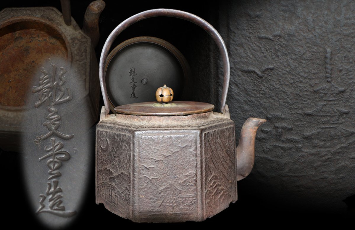 - 【江】釜師名人 龍文堂造 山水楼閣月風景文雷文把手八角形鉄瓶 高さ22㎝ 古美術品(茶道具茶器薬缶湯沸)AX1794 LTefii