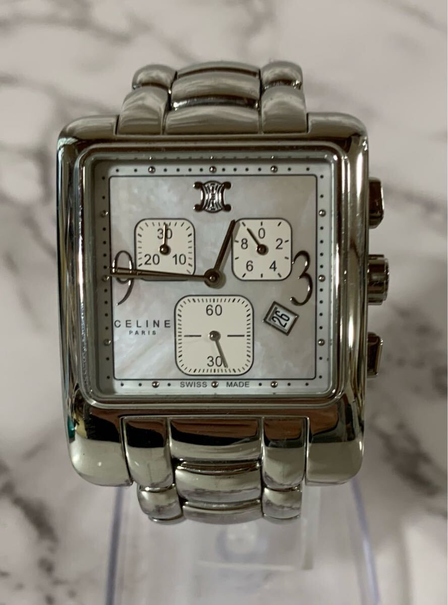 - 88え【稼動品】CELINE セリーヌ 腕時計 クロノグラフ カレ シルバー ホワイトシェル ベルトサイズ15cm 1円〜