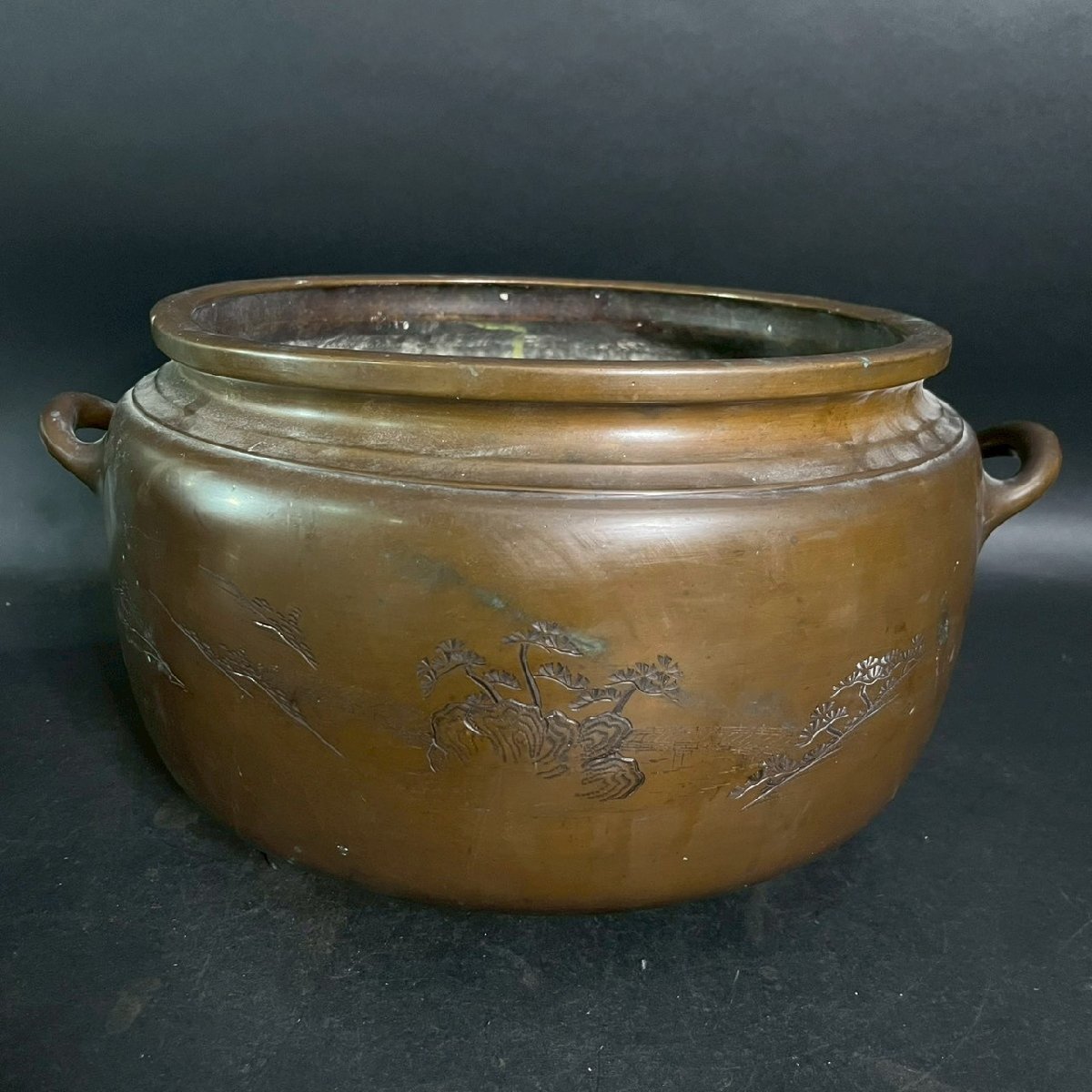 - CV1021-59-3 火鉢 鉢 茶道具 銅器 銅製 鷹 彫刻 大型 炭火 伝統 工芸 骨董品 時代物 古民具 古道具 高さ24㎝ 口径36㎝ 120サイズ