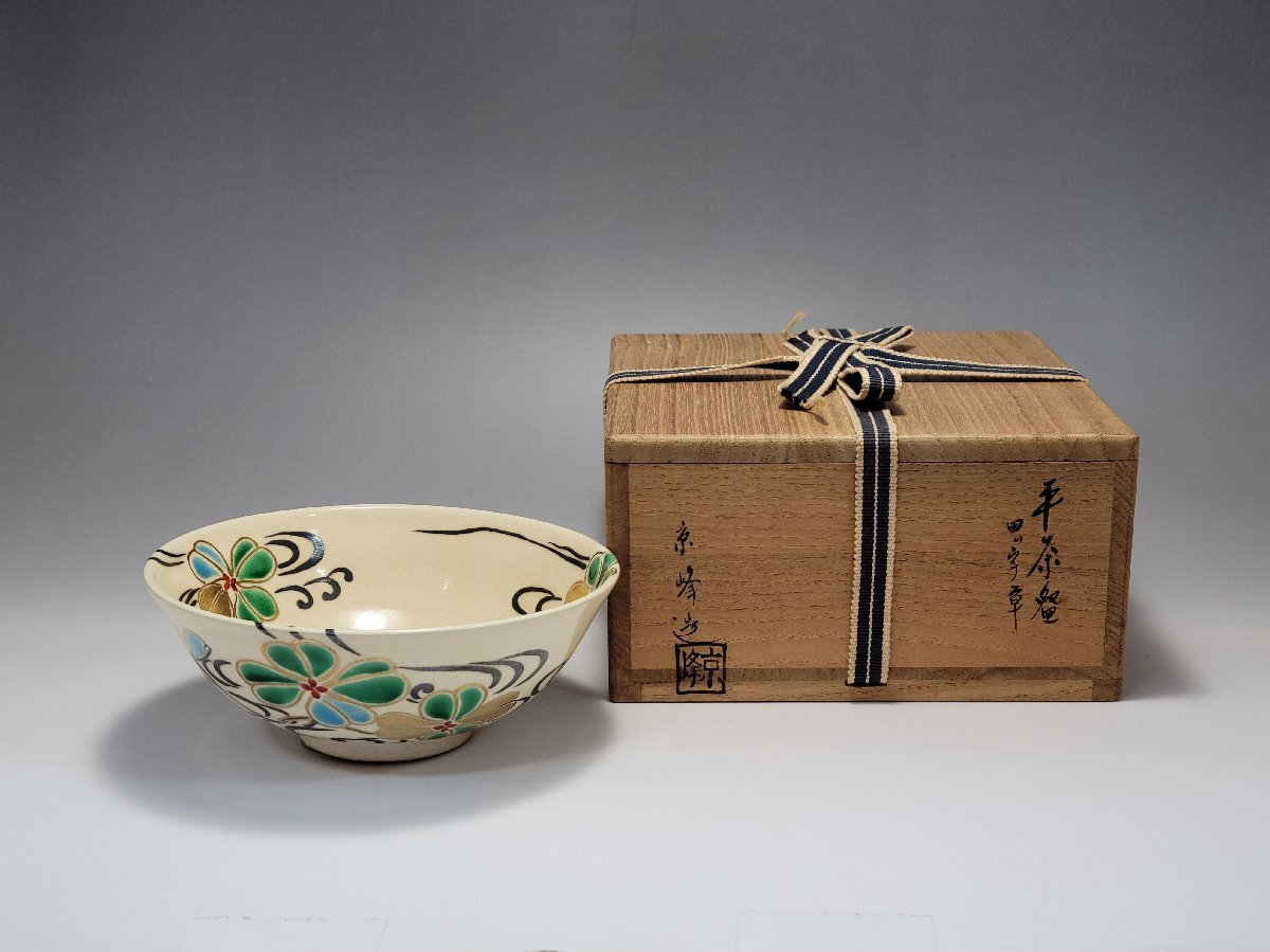 > 京焼 京峰作 田の字草 平茶碗 共箱 幅約14.4cm / 茶碗 茶道具 煎茶道具 茶器 陶瓷器 唐物 人間国宝 李朝 高麗 古玩 古董