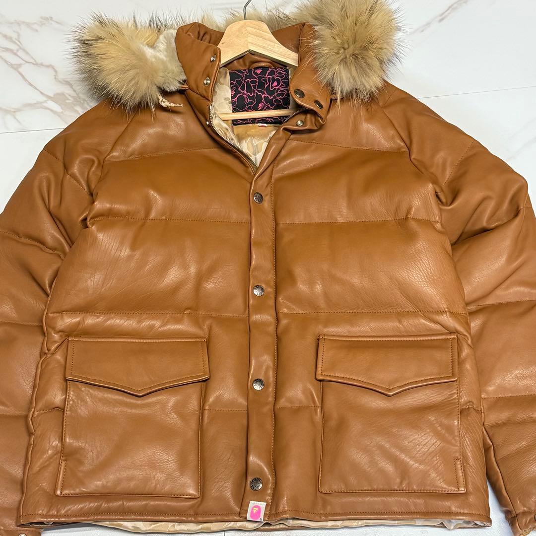 > 【L相当】A BATHING APE アベイシングエイプ カウレザー ダウンジャケット フード取り外し可能 ファー 毛皮 牛革 本革 メンズ ブラウン系