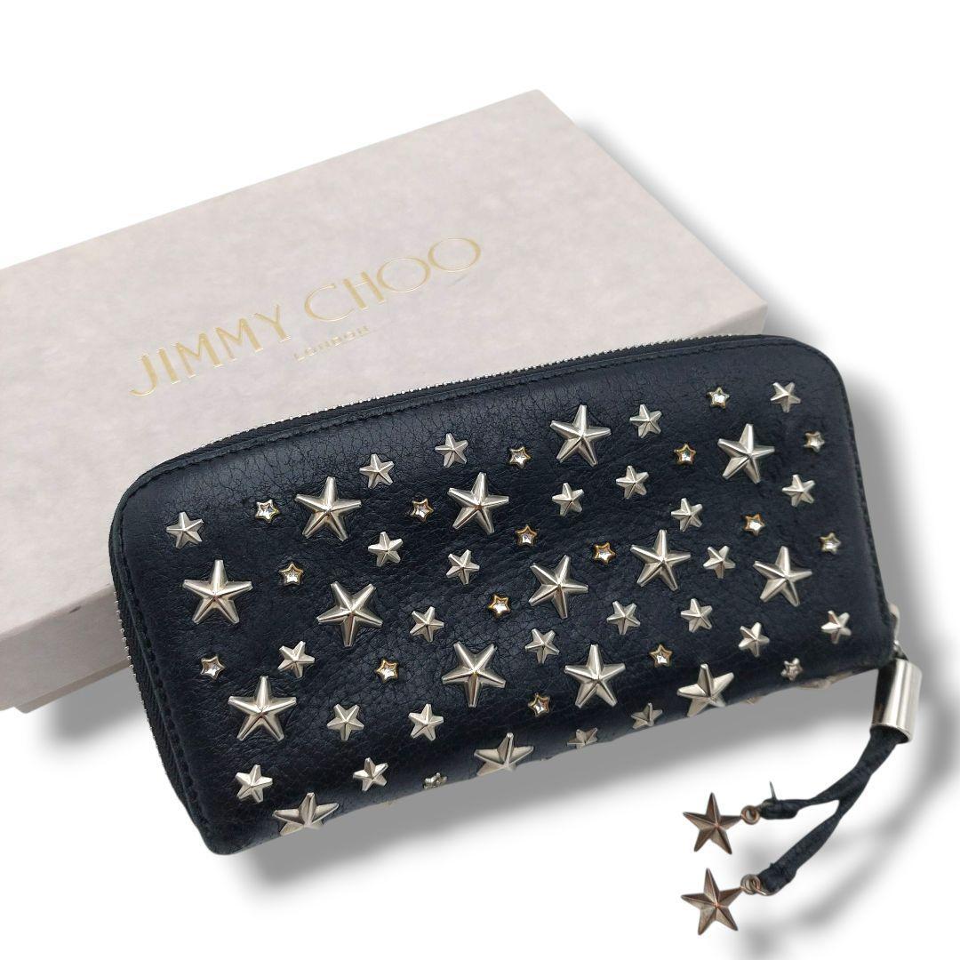 > 【希少】JIMMY CHOO ジミーチュウ 長財布 スタッズ レザー ラウンドジップ ブラック 箱付き 希少モデル ソフトケース付き