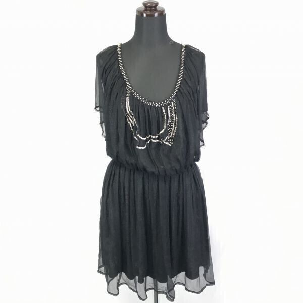 - (処分市)★シルク100%★Cara★シフォン素材/チュニックワンピース【M/黒系】ビーズ装飾/ドレープデザイン/別布インナー付き◆BF278