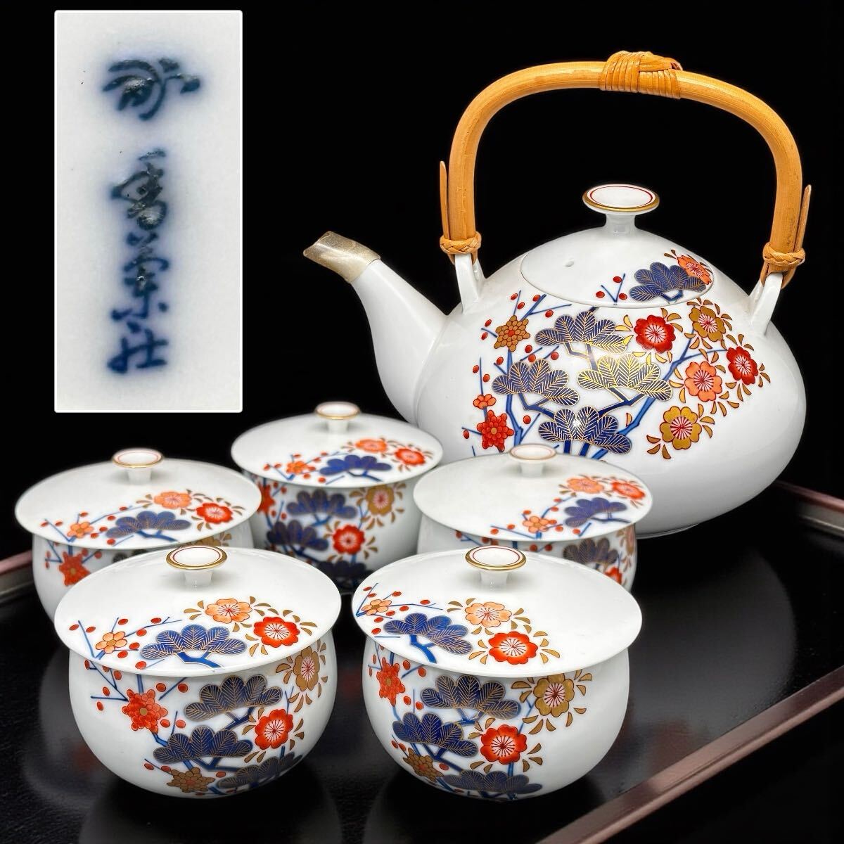 - 【オールド香蘭社】茶器セット金彩色絵 松梅牡丹花紋 旧香蘭社刻印 アンティーク 茶道具 有田焼 染錦 白磁色絵付 急須 蓋付き湯呑 蓋物