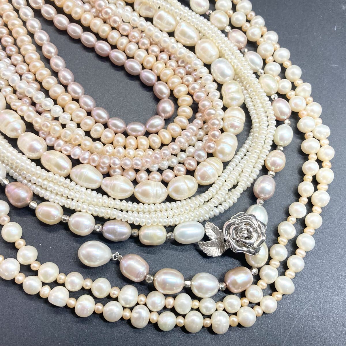 > K18入り!!テリ良し!!■淡水パールネックレス7点おまとめ■ n 約318.6g 本真珠 ピンク パープル マルチカラー 大粒 ベビー グラデ C940