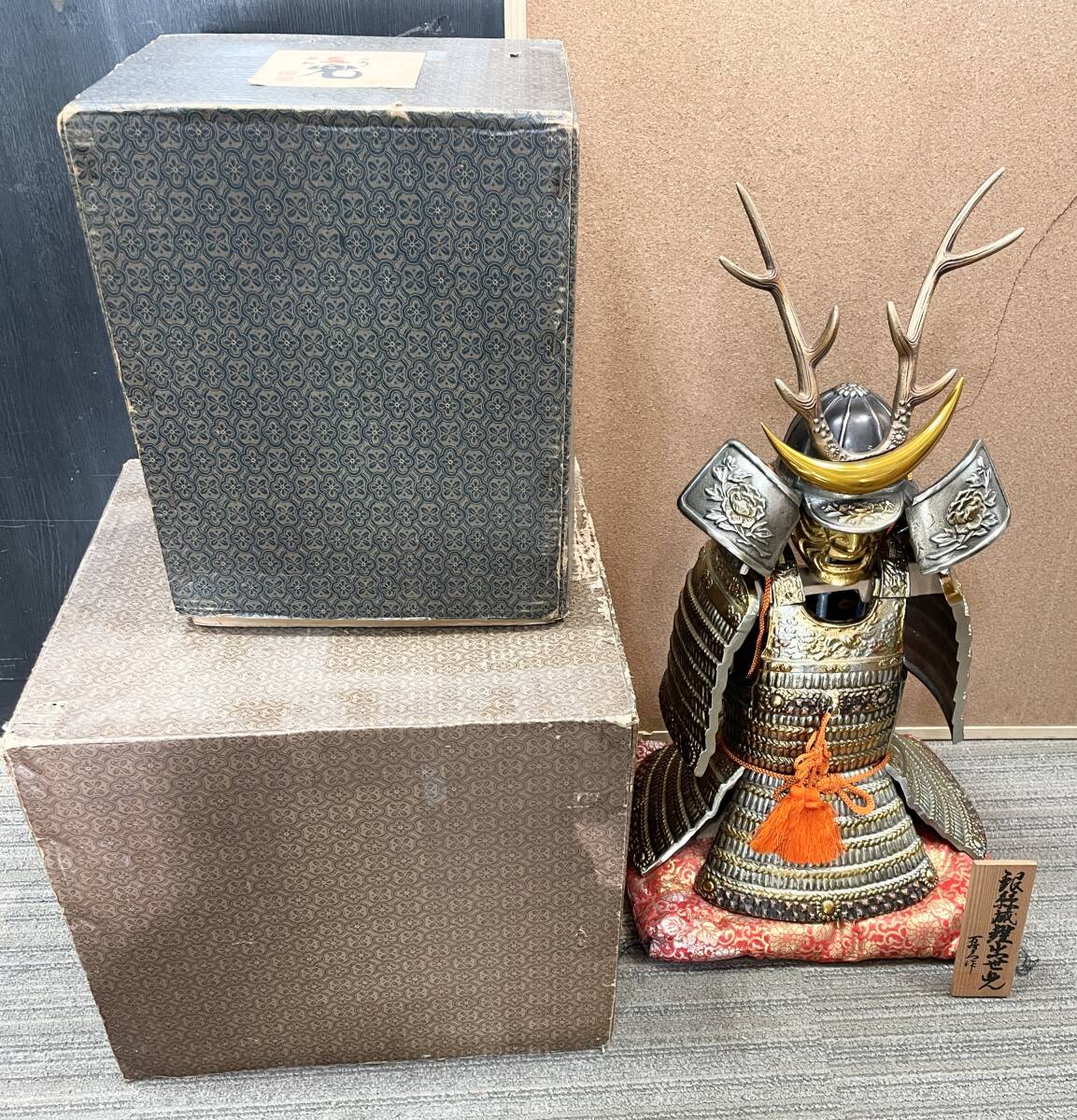 - ☆金属製、箱付き☆銀絲威鎧出世兜 万右エ門作 五月人形 甲冑 鎧兜 置物 オブジェ 全長約60㎝