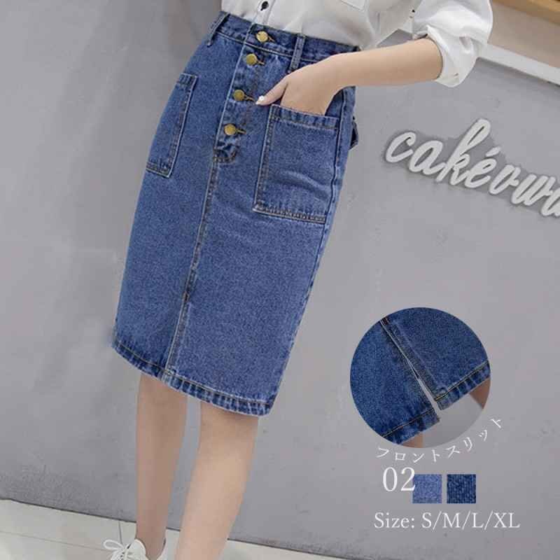 - デニムスカート スリット 膝丈 タイトスカート フロントボタン 細見え XL ダークブルー