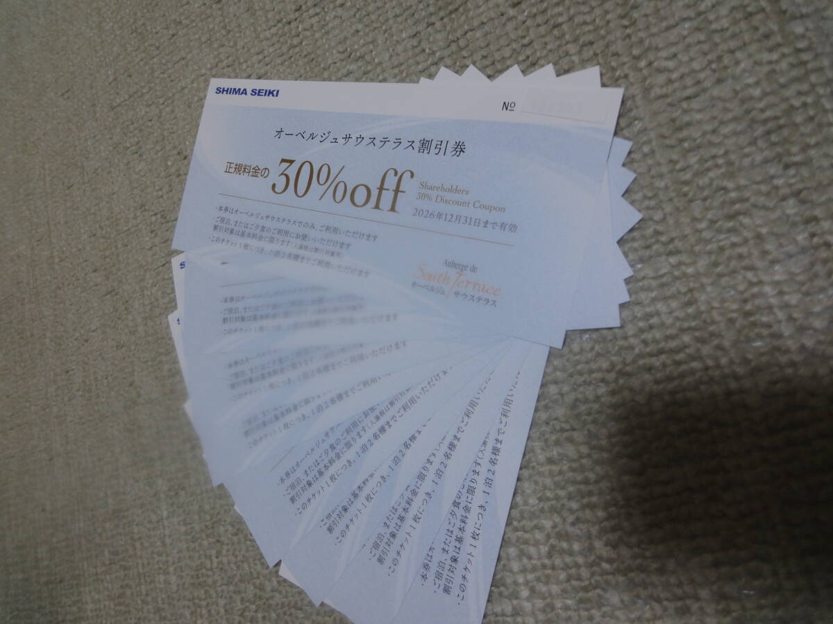 - 島精機製作所 株主優待券 オーベルジュサウステラス 割引券 30%OFF券 8枚セット 有効期限:2026年12月31日迄