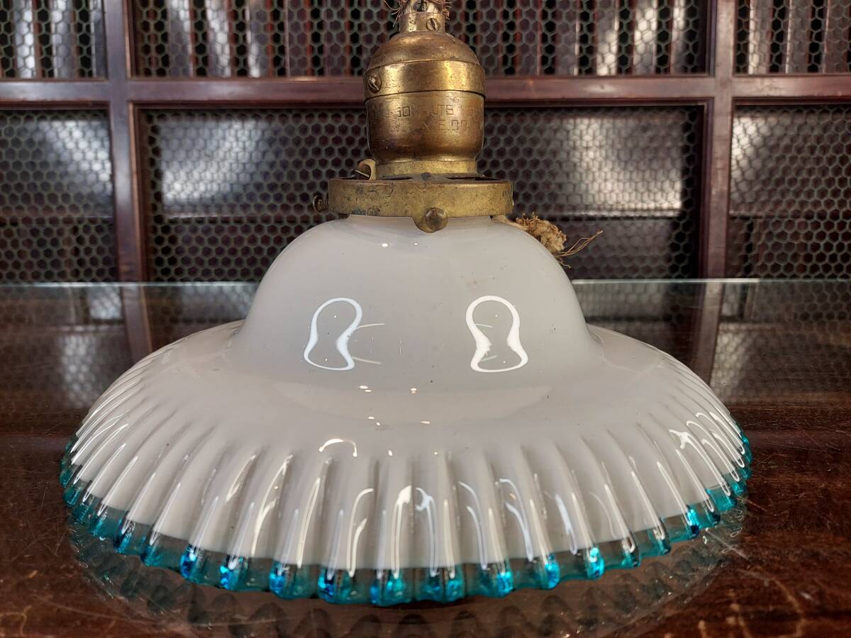- K05-1031 大正ロマン 電気笠 ランプシェード 乳白青緑ひだガラス 真鍮ソケット付属 保証品 美品