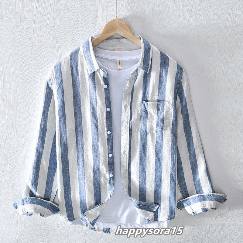 > リネンシャツ メンズ カジュアルシャツ 麻 ストライプ柄 長袖 ポケット付き おしゃれ 羽織り 薄手 涼しい ブルー L