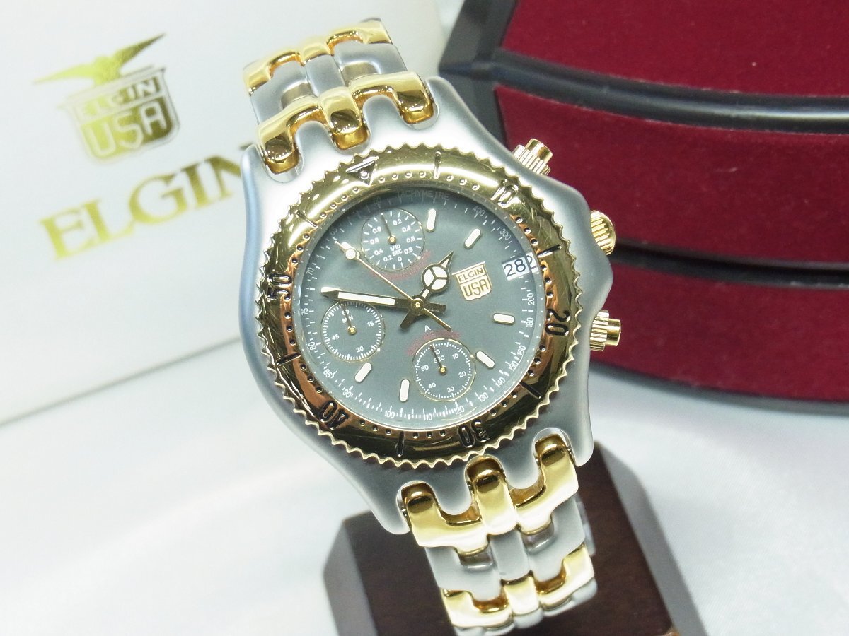 - 1円~【稼働・箱】エルジン ELGIN FK-667-A スポーツウォッチ ボーイズ 腕時計 クオーツ 3針 デイト クロノグラフ ラウンド SSxGP 本体シ