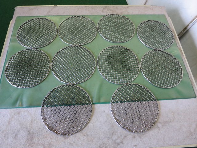 USED(ユーズド) 炭火焼用 ステンレス焼き網 直径23.5cm 円形10枚です。 網目の間隔は約12.5mm 表、裏の形は5・6枚目の写真です。 メーカー、型式は不明 網は真円ではなく多少の変形があります。 清掃済ですが焦げ跡が残っています。 写真は同型、同状態の他グループ製品を流用しました。 サイズ:幅23.5cm 奥行23.5cm 高さ1cm 重量0.3kg