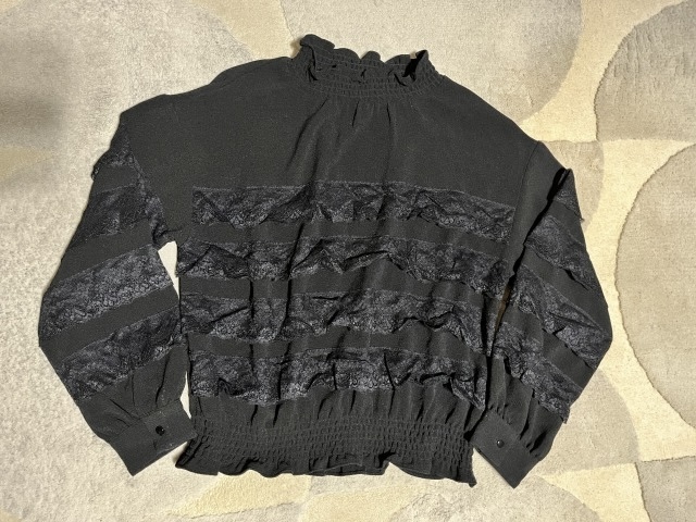 - 美品GUジーユーハイネックゴムシャーリングレースブラウスM黒ストレッチ生地