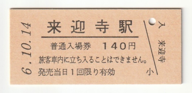 - 平成6年10月14日 信越本線 来迎寺駅 140円硬券普通入場券(日付印刷)