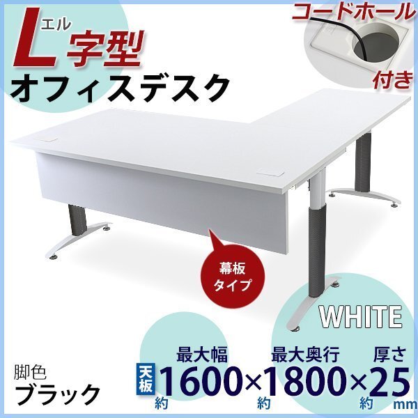 - 送料無料 オフィスデスク デスク L字型 幕板 コードホール付 約W1600×約D1800×約H755 白 平机 ワークデスク 事務机 脚色 黒