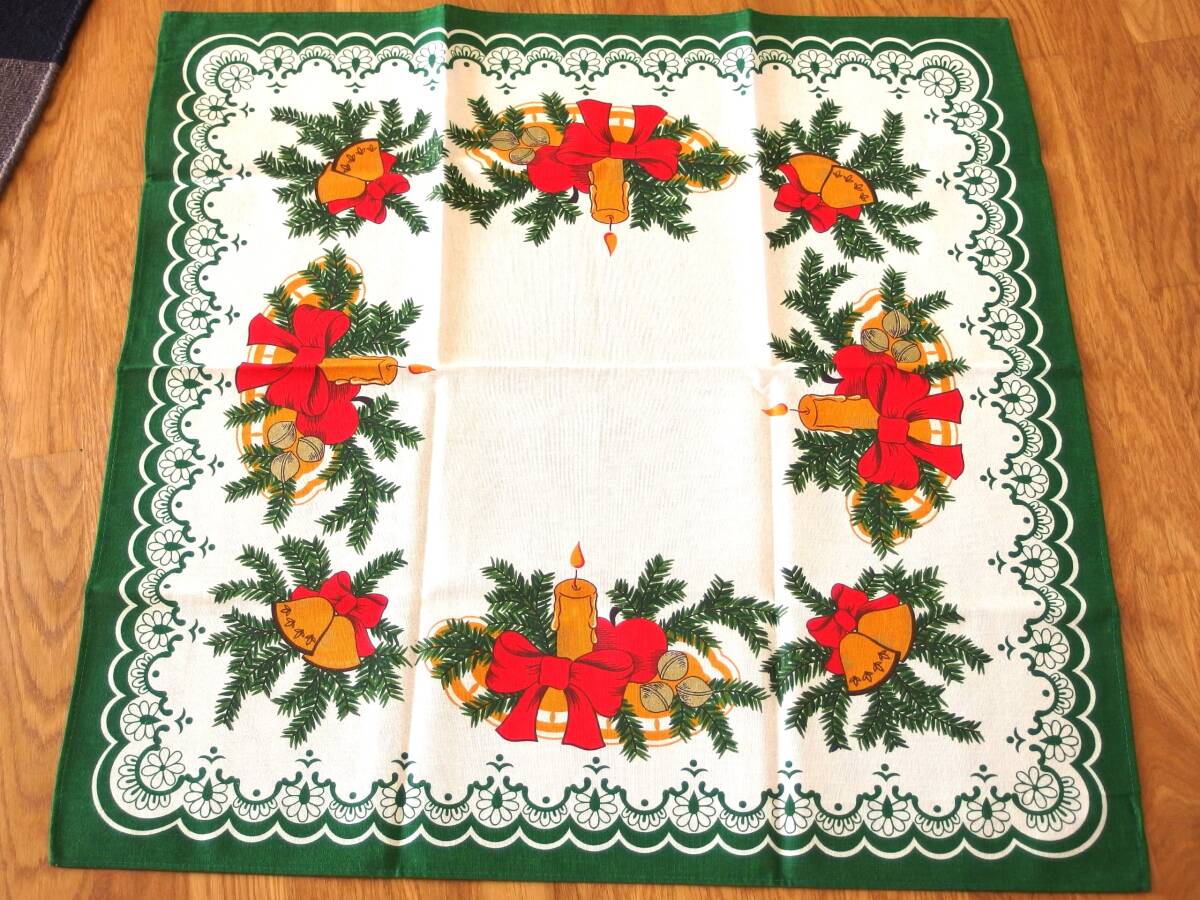 > 新品未使用!クリスマス時期用 ブラジル製 ヴィンテージ テーブルクロス/テーブルリネン (赤いリボン&キャンドル) 77cm X 78cm
