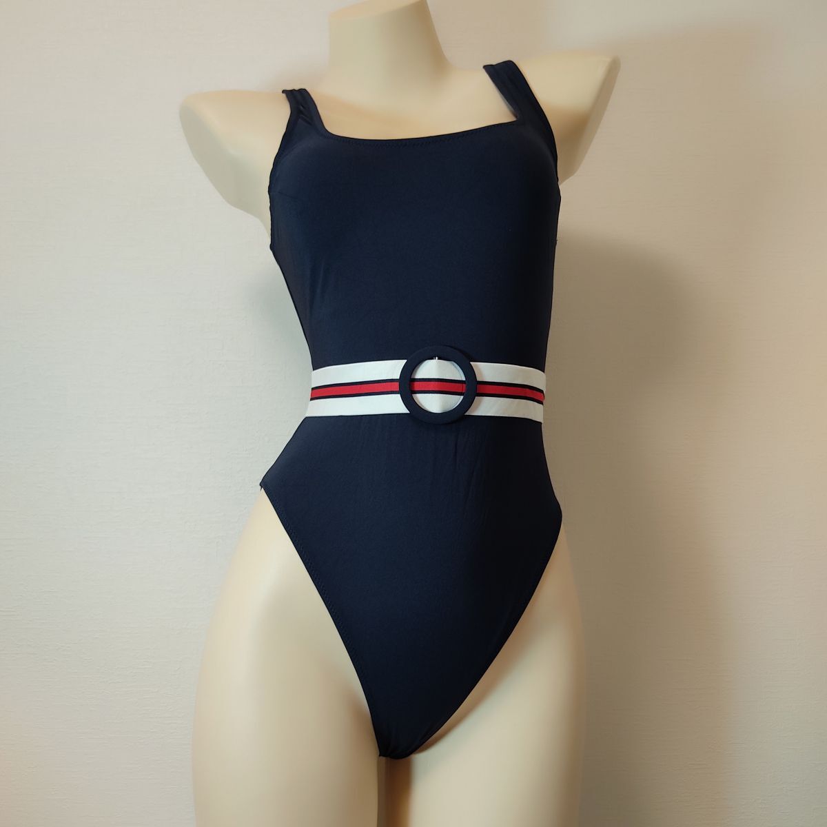 - 54*レオタード(L程度)★ハイレグ光沢ネイビー濃紺ホワイト白レッド赤ベルト★伸縮性あり男性も