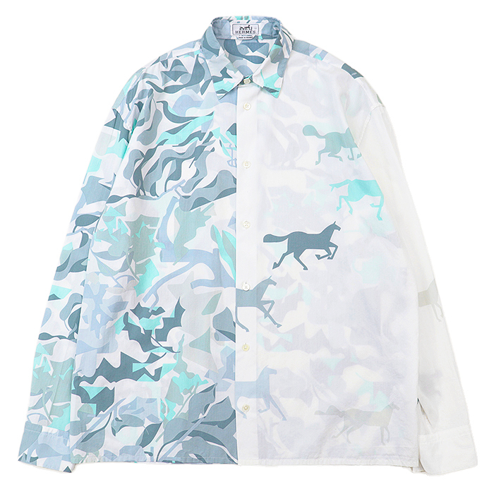 > 【ソルド品】HERMES エルメス ボクシーボディシャツ Puzzle Vegetal プリント セリエボタン 長袖 メンズ 37/14h 白 灰色 ミントグリーン