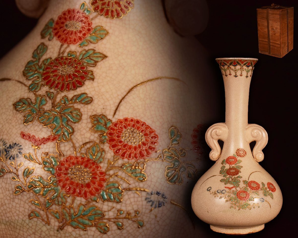 U927 【泉美】薩摩焼 花模様 一輪挿し 耳付花瓶 花入 花生 花器 共箱入拍卖