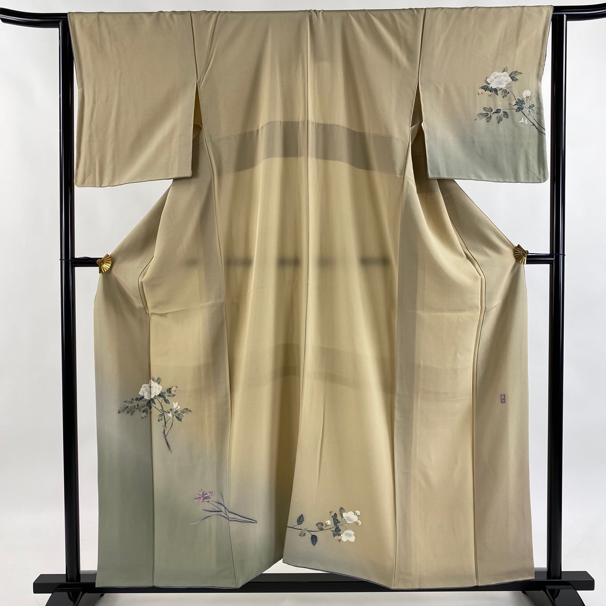 > 【美品】 付下げ 身丈156cm 裄丈64cm M 袷 十日町友禅 藤舟 やまと 落款 牡丹 草花 染め分け ぼかし ベージュ 正絹 秀品 【中古】