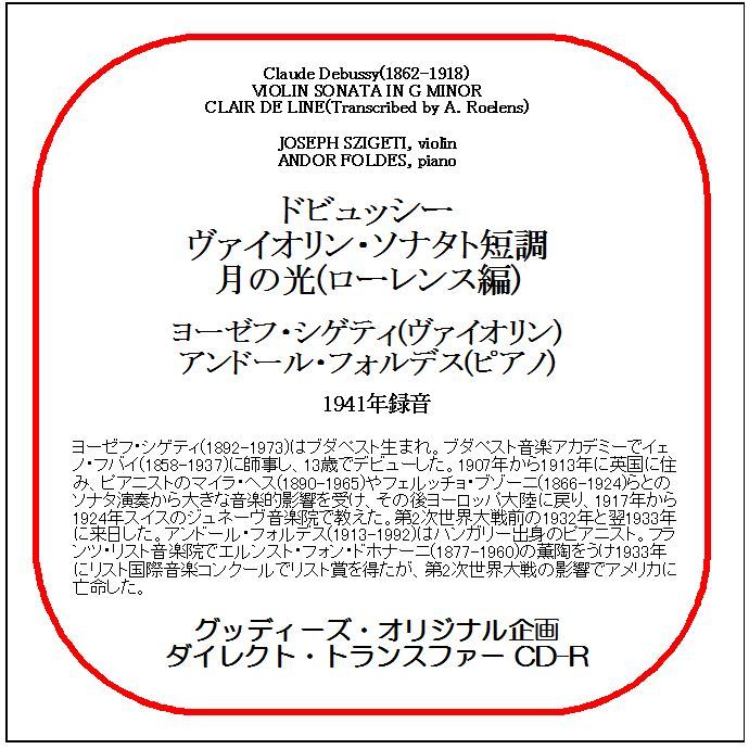 - ドビュッシー:ヴァイオリン・ソナタ/ヨーゼフ・シゲティ/送料無料/ダイレクト・トランスファー CD-R
