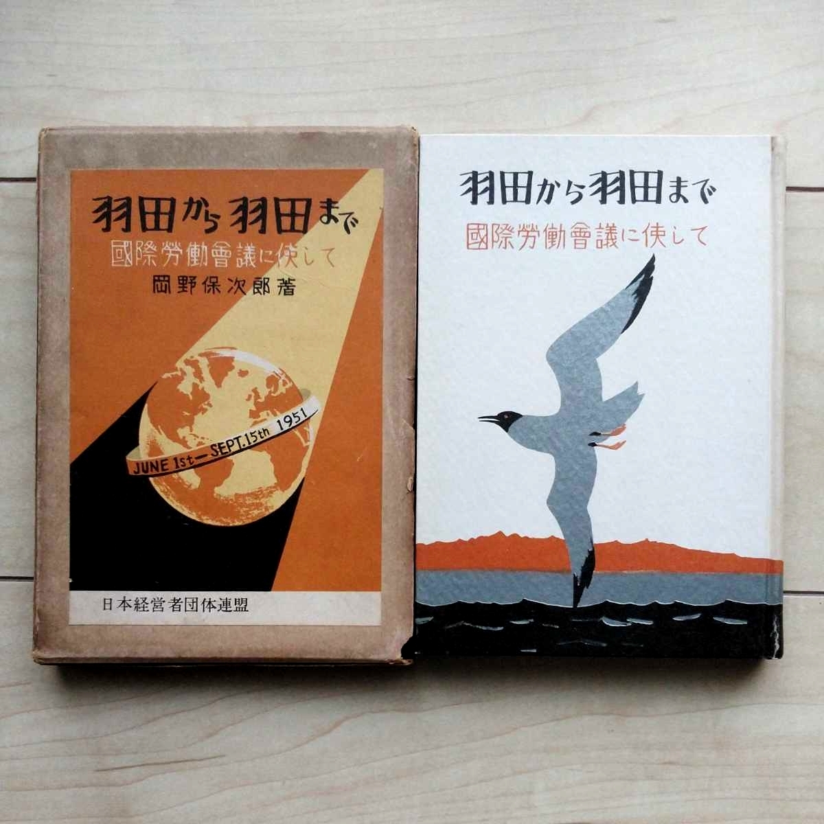 - ■『羽田から羽田まで〜國際勞働會議に使して』岡野保次郎著。装幀挿画・杉浦非水。昭和27年初版凾付。日本経営者團体連盟発行。