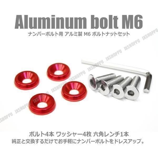 - 送料0円 M6 25mm ナンバーボルトセット [レッド] アルミ製 お手軽ドレスアップ ワッシャー×4 ボルト×4 六角レンチ付 エクステリア