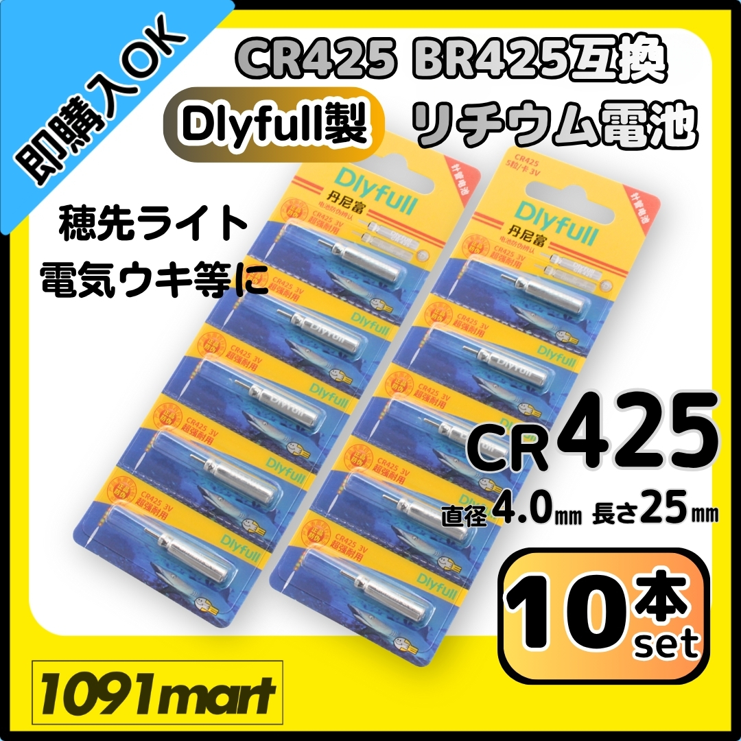 - 【送料無料】Dlyfull製 CR425 BR425互換 ピン型リチウム電池 10本セット 電気ウキ 穂先ライト用 寿命長持ち 夜釣り 高輝度LEDウキ対応