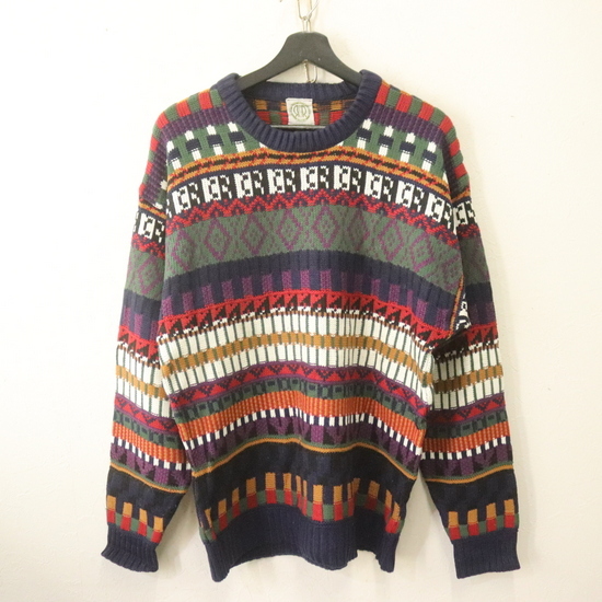 > J998 90sビンテージ R&R アクリルニットセーター■1990年代製 表記サイズ44 ネイビー マルチカラー 総柄 アメカジ ストリート 古着 古着卸