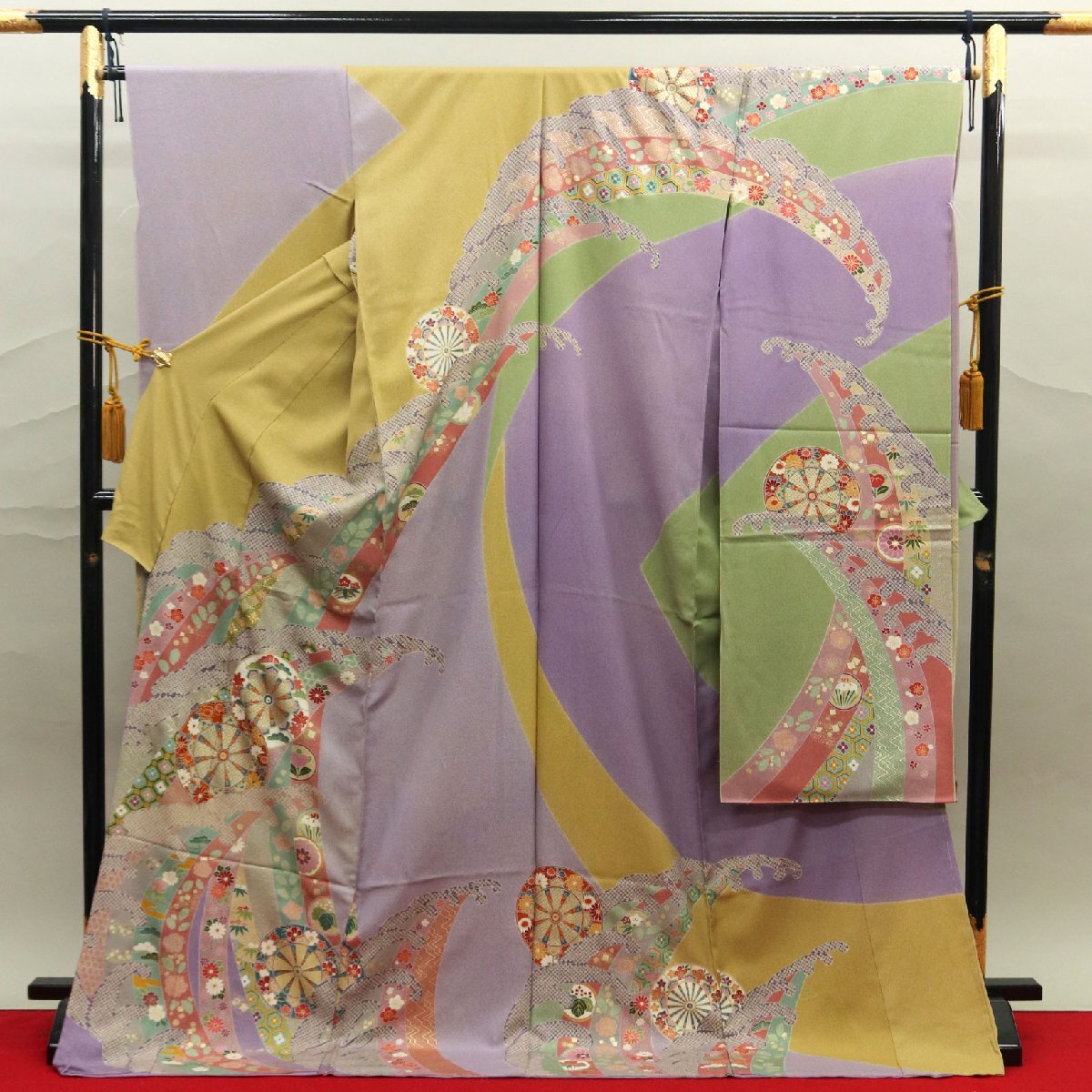 ※こちらの商品にはお仕立てはついておりません。 (出来上がり予想寸法 身長:171cm位、裄:最大65cm位) 正絹青々調お振袖をご紹介致します。 こちらのお品には、薄い青紫系の八掛けが付いております。梅が描かれております。 さらりとした上質な生地は、灰黄色、青紫色、柳色などのお色目で染め分けられております。生地にはたたき染めが施されております。 全体には赤色、緑色、グレー、紅藤色、水色、赤紅色、青紫色菜そのお色目で、波文や片輪車文が染められております。模様には金彩加工や、上前の一部には金駒刺繍が施されております。 落ち着いた大人な印象のお振袖でございます。 -状態・素材:正絹 -落款・証紙: -参考着用年代:10代~40代 -着用時期 :10月~5月