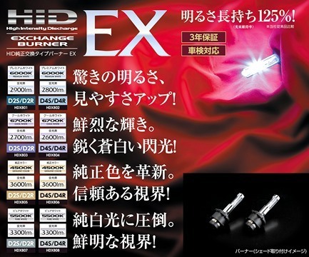 > 在庫市/引き渡し可能「ヴァレンティ/JEWEL」HID純正交換バーナーEX(D4S/D4R)x1セット(ピュアホワイト5500K/品番HDX808)