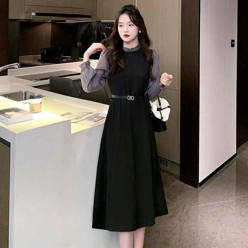 - 長袖ワンピース フリル 切り替え スリム 着痩せ 【大きいサイズあり】 2XL ブラック