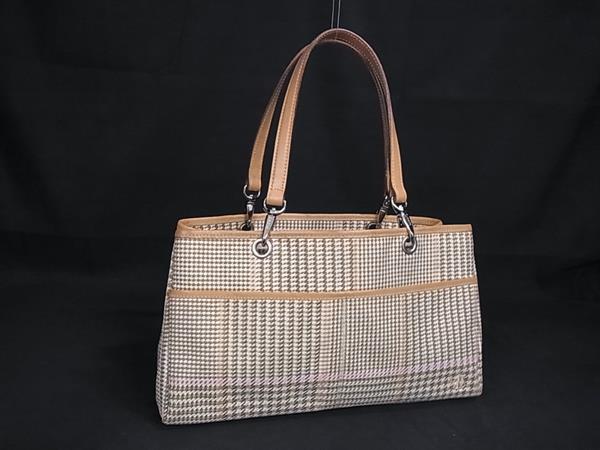 - 1円 ■美品■ LAUREN RALPH LAUREN ローレンラルフローレン キャンバス 千鳥格子柄 ハンドバッグ トート ベージュ系×ブラウン系 FV3875