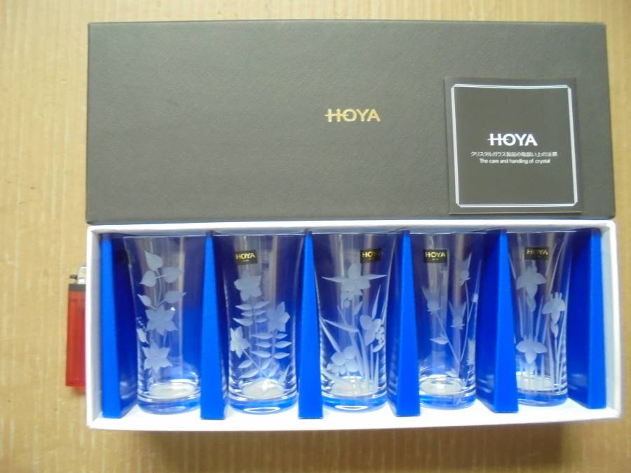 > HOYAガラスコップ② 5個 クリスタルガラス 切子 絵替わり 紙共箱付 未使用 美品 7091 京都雲屋