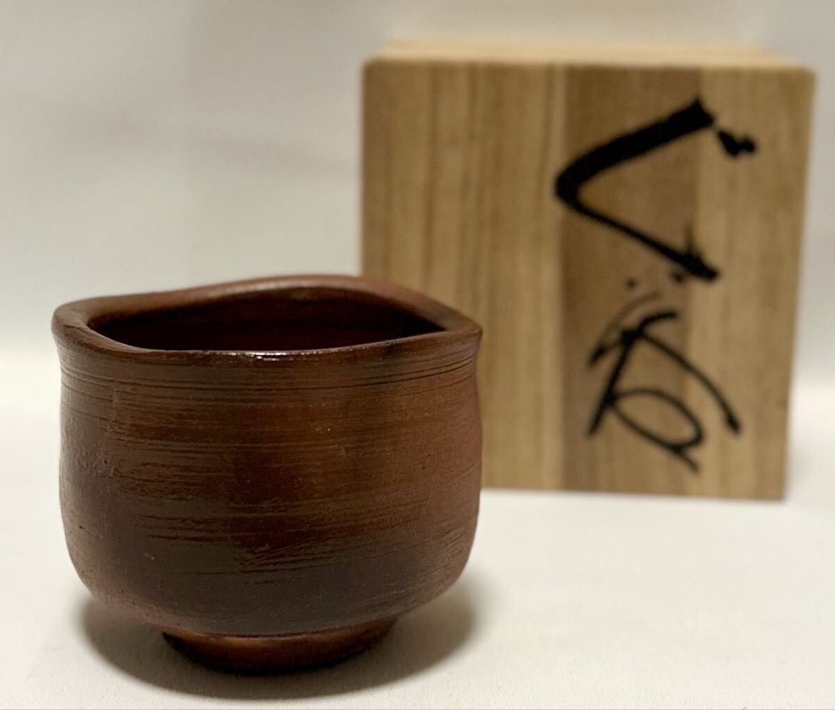 - 大谷焼 四代 矢野款一 ぐい呑 共箱 朱泥 薪窯 徳島民芸 土味 手仕事 酒器 酒盃 Tokushima Otani ware Guinomi 陶芸 工芸 美品