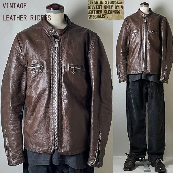 > ★名作【希少 ビンテージ デザイン 風合い◎ 修理済み】レザー 70s~80s ビンテージ シングル レザー ライダース ライナー無し M-L程度 茶