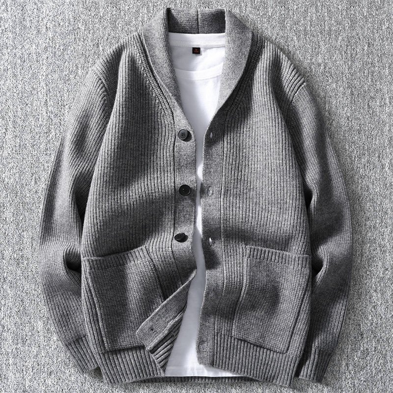 - 新品 ウール混 ニット カーディガン リブニット 秋冬 厚手 襟付き 無地 セーター メンズ 秋冬 暖かさ ニットジャケット グレー T6175-XL