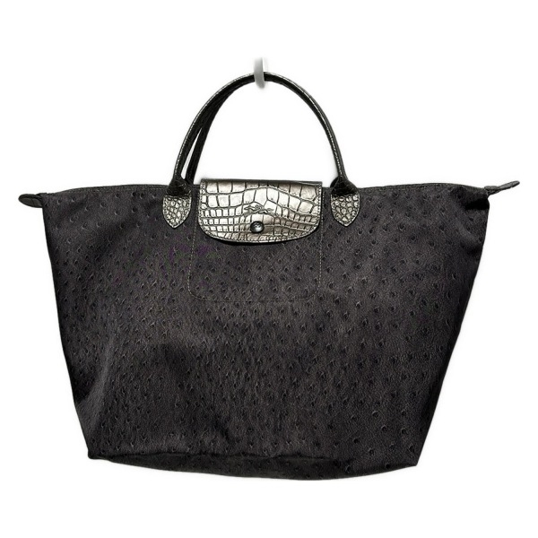 - ロンシャン LONGCHAMP ハンドバッグ - レザー 黒×ダークブラウン 型押し加工/オーストリッチ柄 美品 バッグ