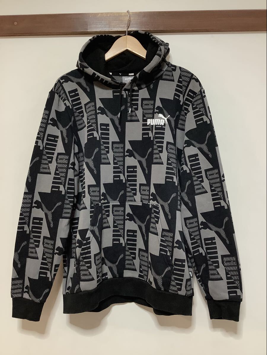 > な1730 PUMA プーマ ロゴ総柄 Hoodie フーディー スウェットパーカー XL 裏起毛 プルオーバー グレー/ブラック ロゴプリント