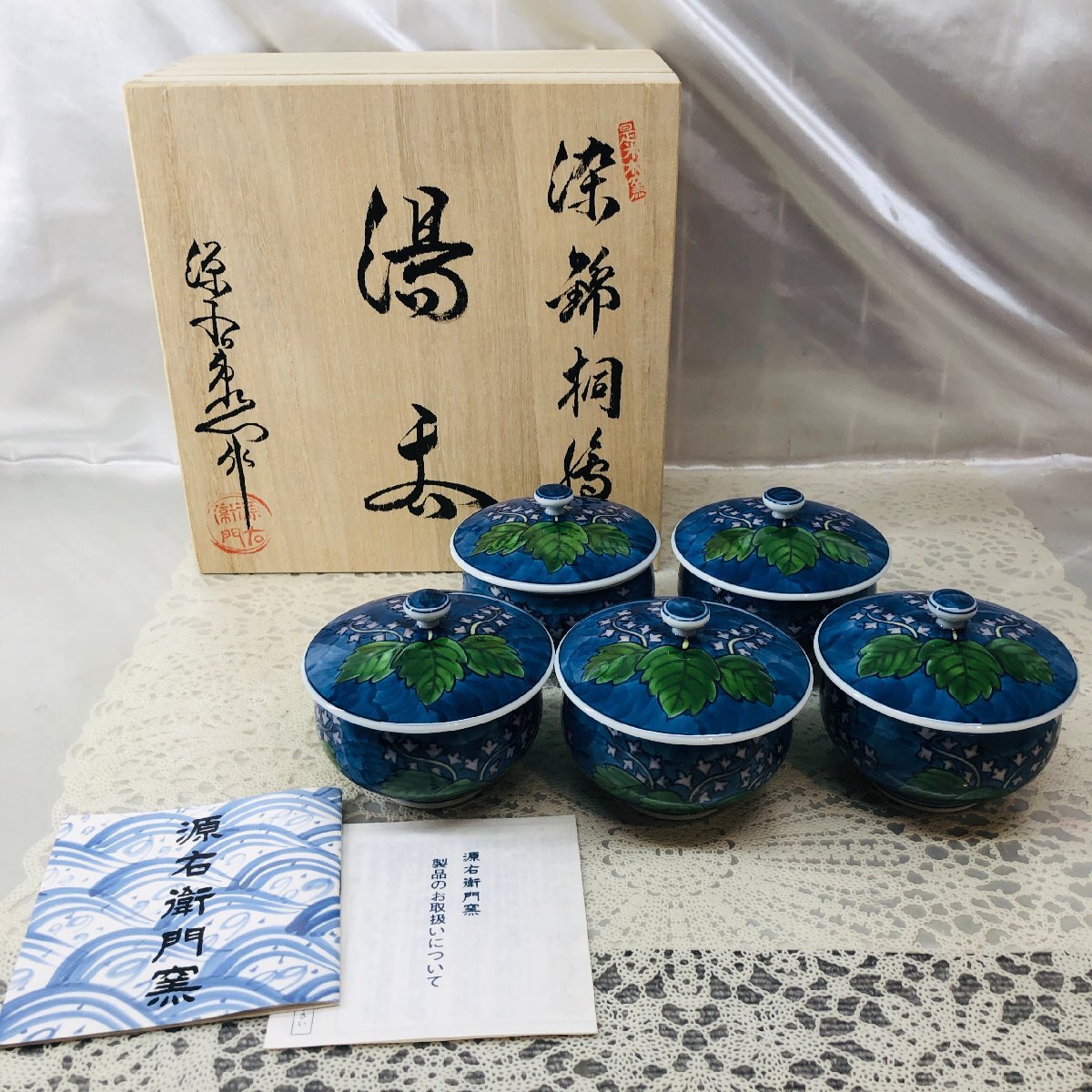 - 【未使用/保管品/KU】有田焼 源右衛門 染錦 牡丹唐草 蓋付 湯呑みセット 陶器 茶器 和食器 5客セット 共箱付 MZ1108/0067-2
