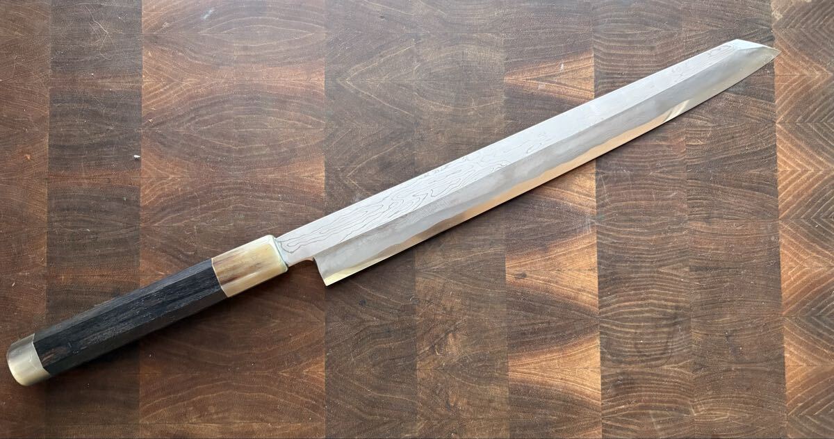- 美品 堺打刃物 青一鋼 墨流し 切付 柳刃 包丁 300mm 尺 ダマスカス 中川刃物 切付包丁 紋鍛錬 和包丁 刺身包丁