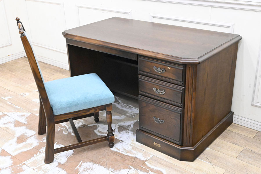 - GI28 美品 高級家具 ブライトン オーク材 英国調 イギリス風 重厚 木目 片袖机 プレジデントデスク 書斎机 勉強机 椅子付き チェア セット
