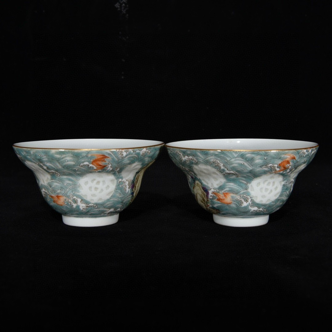 - 永し 清時代 乾隆年製 粉彩福海紋 玲瓏杯 一対 古陶磁器 陶芸 皿 中国陶瓷器 唐瓷 置物擺件 古美術品 古賞物 収集 旧家蔵出 中国唐物