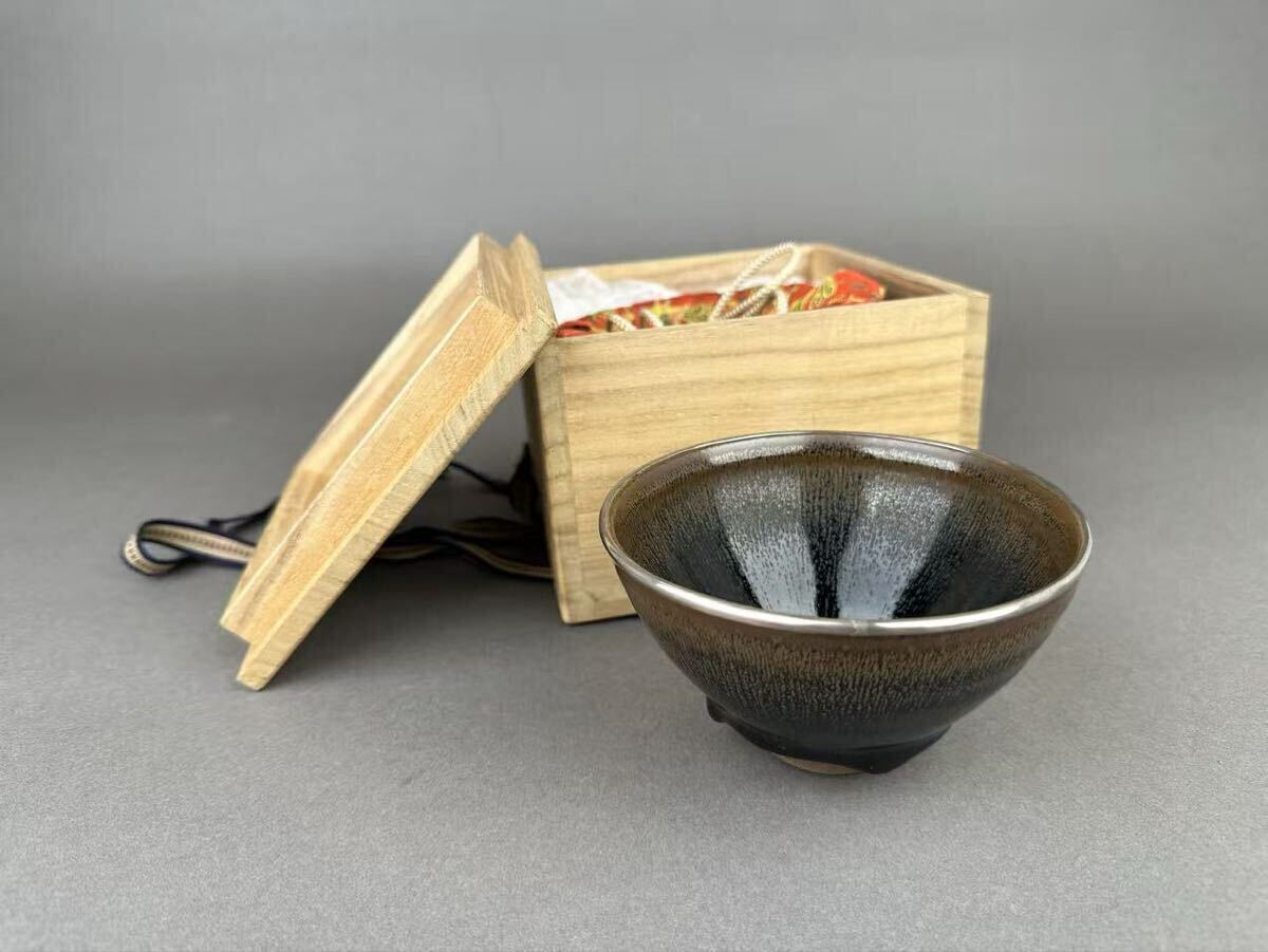 - 宋時代銀象嵌建盞 天目茶碗 酒器 茶道具 茶碗 陶磁器 旧家整理品 箱付